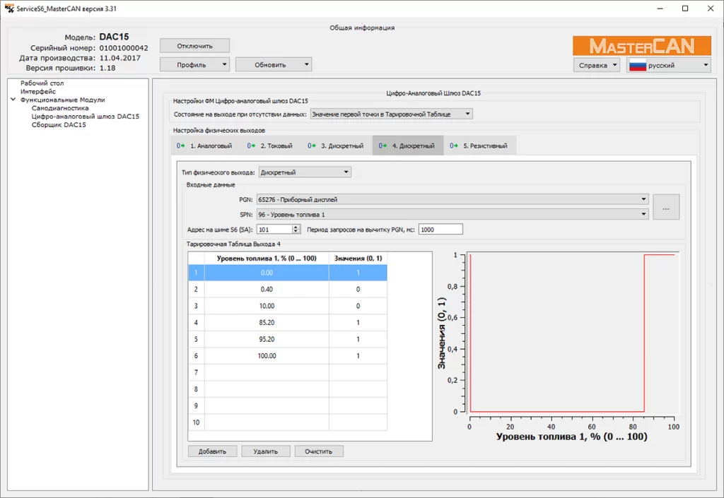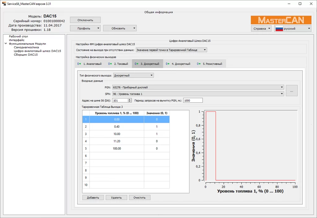 Поскольку значения минимального и максимального уровней указываются в процентах от объема бака, необходима предварительная тарировка бака с записью данных в память датчика DUT-E. Тарировка бака — процесс создания таблицы зависимости между уровнем топлива в миллиметрах и объемом в литрах. Аккуратная тарировка повышает точность измерение остатка топлива.